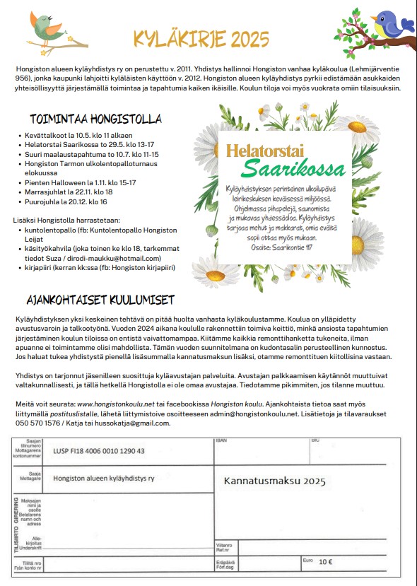 Kyläyhdistyksen kannatusjäseneksi pääsee kotitalouskohtaisella 10 €:n kannatusmaksulla, jonka voi maksaa missä tahansa vaiheessa vuotta yhdistyksen tilille LUSP FI18 4006 0010 1290 43. Jos haluat kartuttaa remonttirahastoamme tai muulla tavalla tukea yhdistyksen toimintaa ja vanhan koulukiinteistön ylläpitämistä, otamme kiitollisina vastaan kaiken tuen.